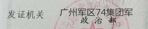 第三处:发证机关写的是“广州军区74集团军政治部”,且不说原广州军区在五六年前就撤销编制了,就说当年没有撤编时也没有第74集团军啊,这是后来军队编制改革后才有的,隶属于南部战区陆军。