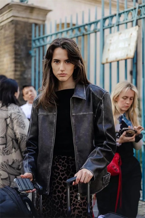本季非常流行的复古皮夹克,也合适搭配毛衣和半裙。选择款式简洁的黑色“一字领”毛衣,叠加一件复古风皮衣,帅气又时髦。裙子可以选择今年很火的豹纹裙,和皮衣的潇洒不羁很般配,有一种野性的美。
