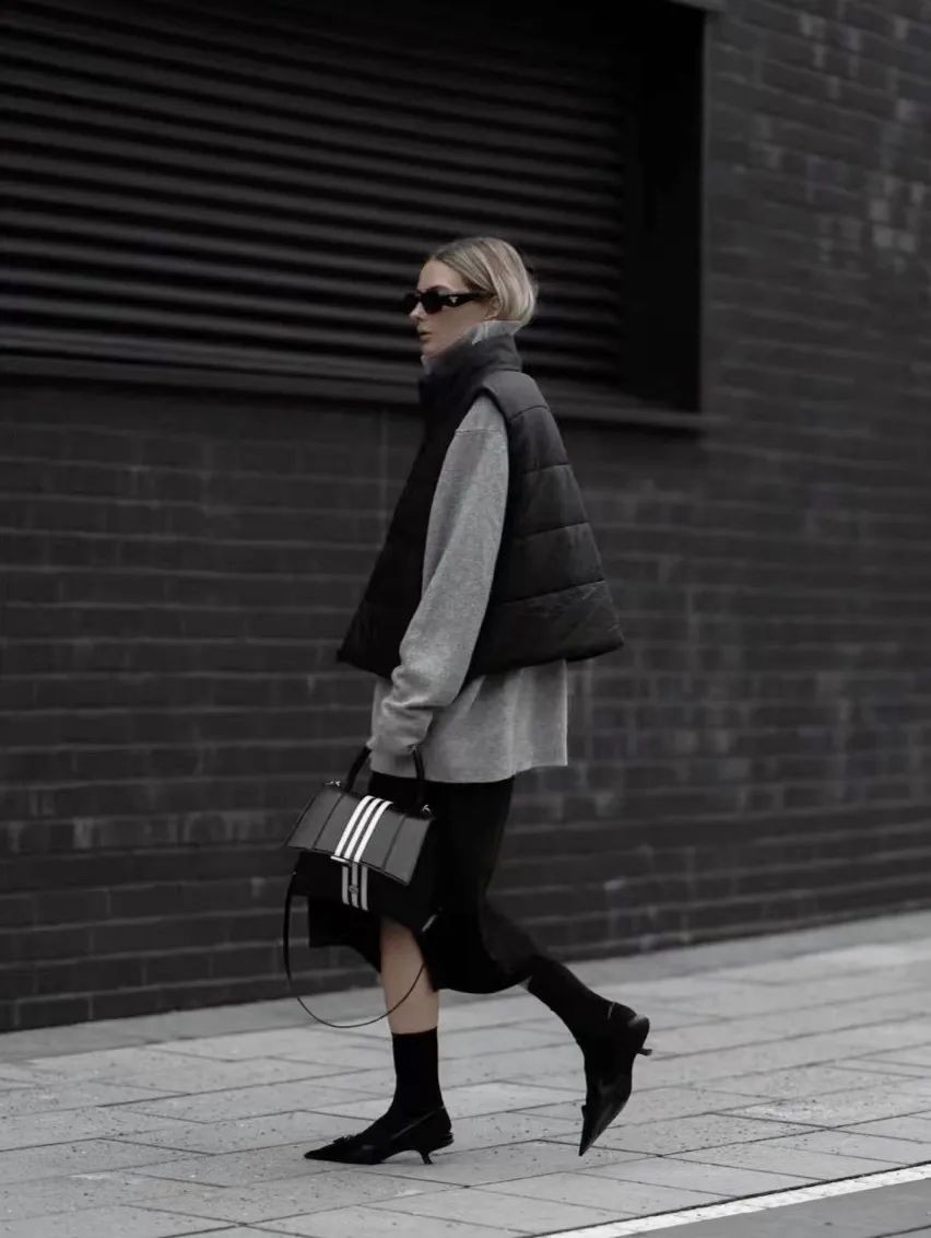 羽绒服和毛衣的组合,暖上加暖。如果想显得利落一些,可以选择黑色羽绒背心和灰色毛衣叠穿,裙子和靴子也选黑色,维持简约配色,感觉更显高级。