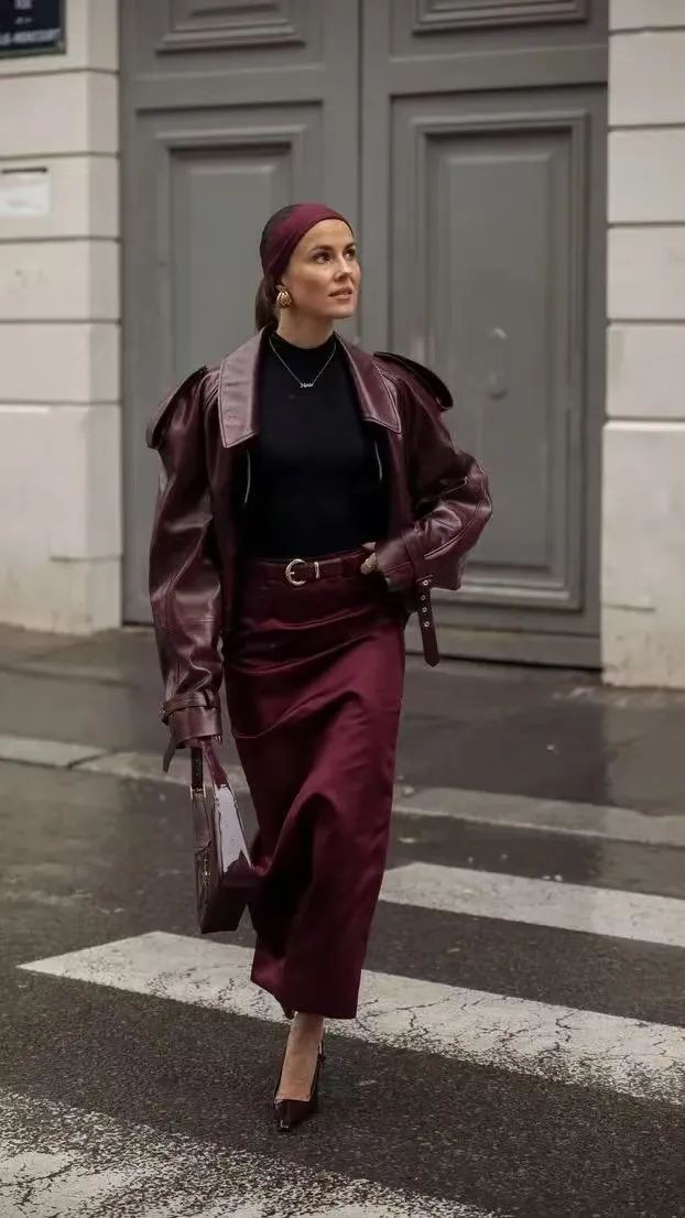 “安可拉红”是这个秋冬的主打流行色。皮衣和裙子采用近似色系进行搭配,内搭选择纯净的黑色毛衣,整体非常有温暖复古感。
