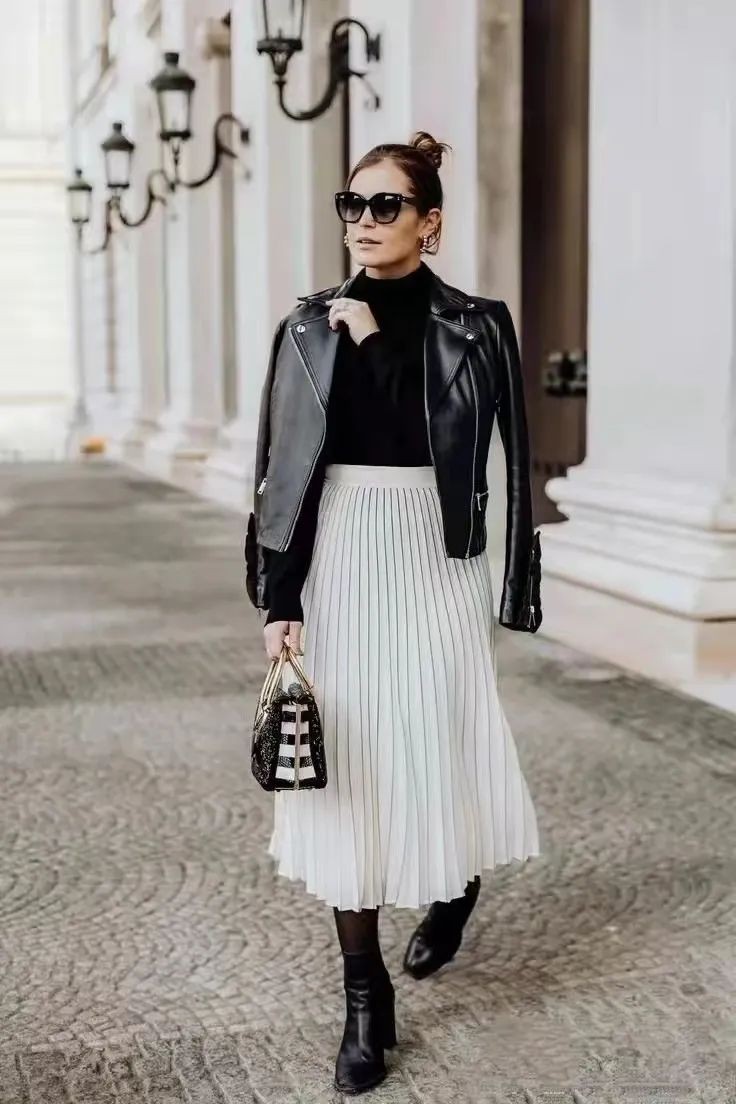 西装领的“机车夹克”,适合和半高领或者高领毛衣叠穿。外套、内搭与靴子全都选黑色更酷更帅,整体配色也更简练。裙子可以搭配白色系的百褶裙,让造型更有细节美感。