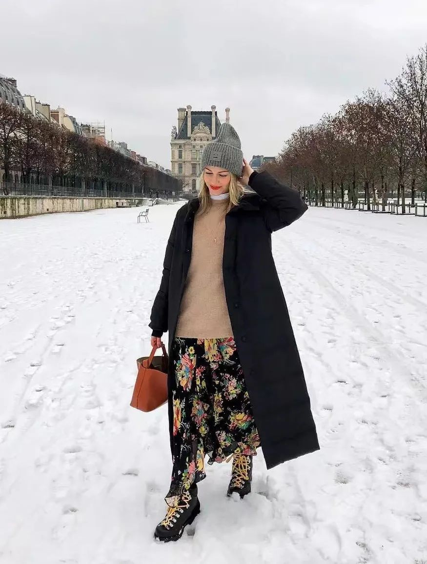 大衣+毛衣+印花裙,演绎冬日浪漫,又暖又美。