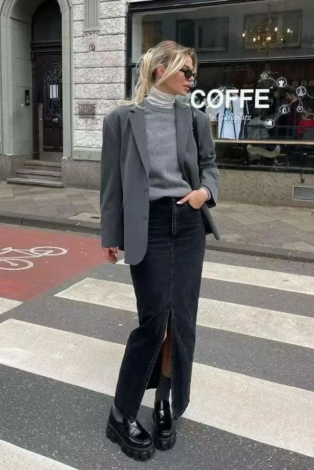 灰色西装+灰色毛衣,同色系叠加有点单调,在底下加多一件白色的高领打底衫,层次感立刻显现。裙子可以试试黑色系的开衩牛仔长裙,和西装的帅气很相配,而且修身的长裙会显得整个人更修长。