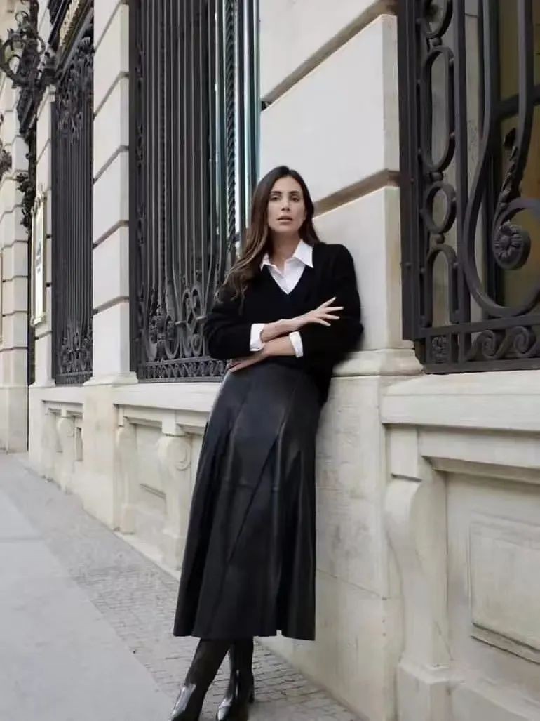 黑色毛衣底下加一件衬衫,比单穿多了几分知识分子的知性美,下装搭配黑色的皮质半裙,更多一份优雅。靴子的加入又能带来帅气利落的感觉。
