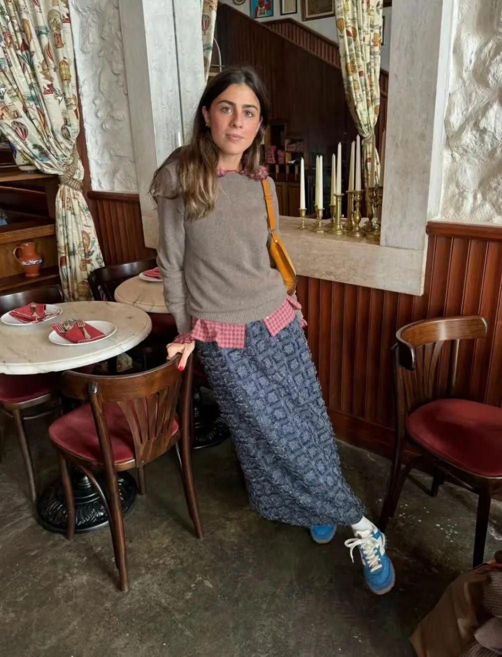 灰色毛衣内搭粉色格子衬衫,再加上一条蓝色系的直筒长裙,很与有文艺气息。