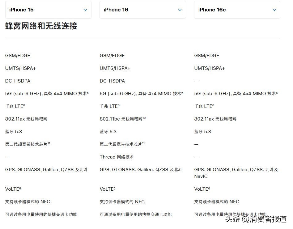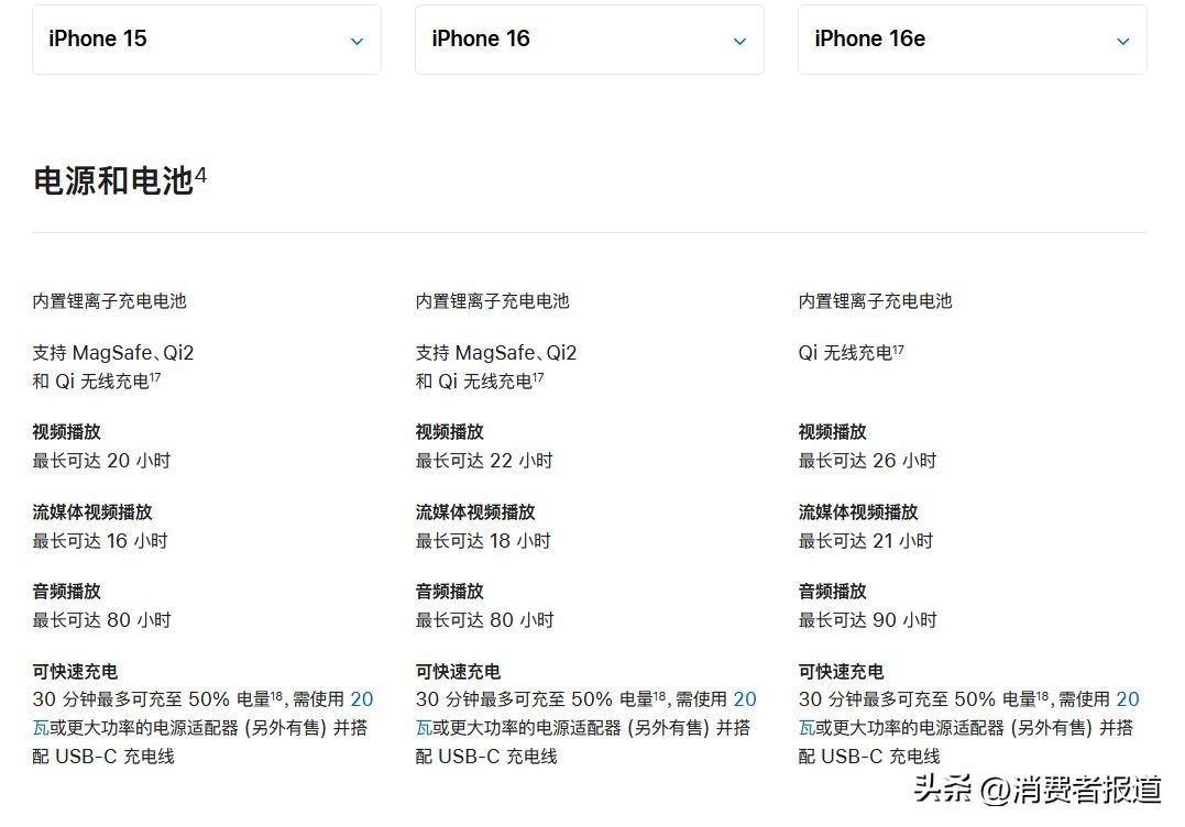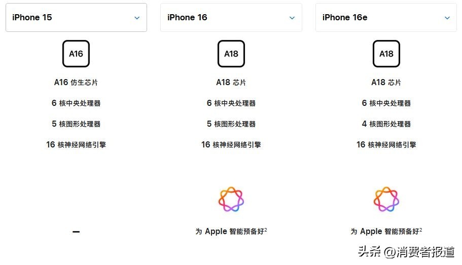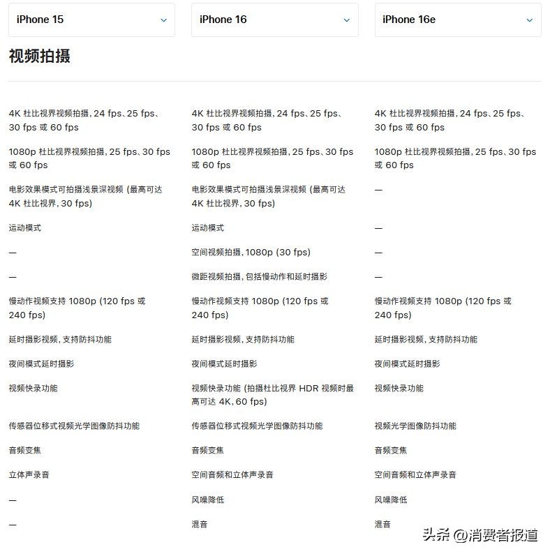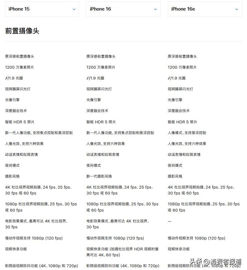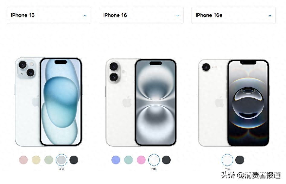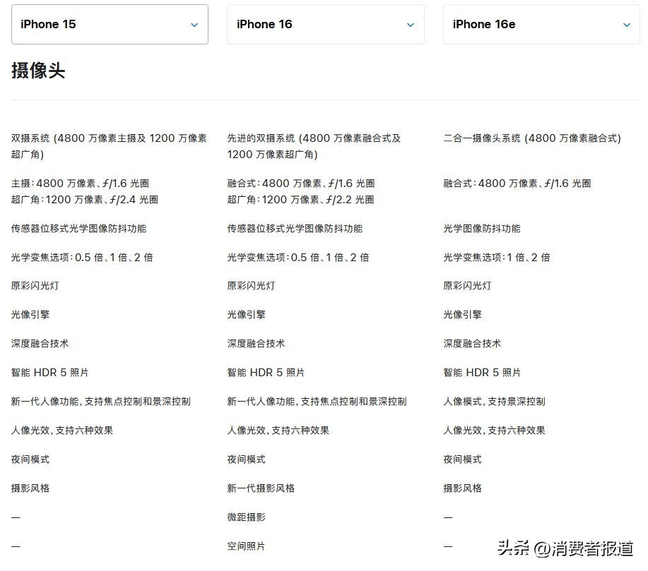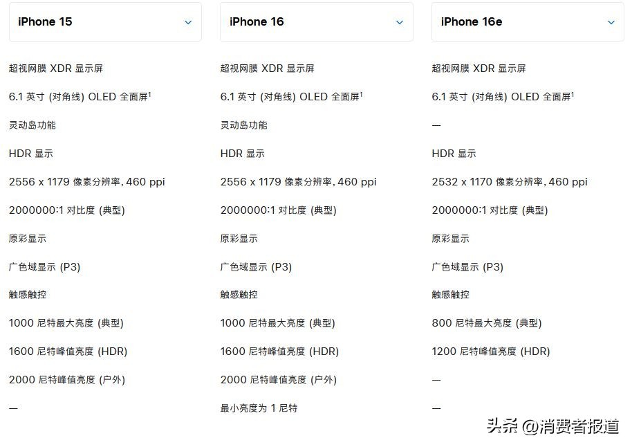 虽然苹果方面宣称“以更超值的价格为用户提供强大功能”,但iPhone 16e上“单摄”“刘海屏”“128GB起步”等过时元素还是让消费者对其产品竞争力感到担忧。《消费者报道》对比了iPhone 16e、iPhone 16、iPhone 15三款机型,为大家一一盘点iPhone 16e到底减配了哪些地方。