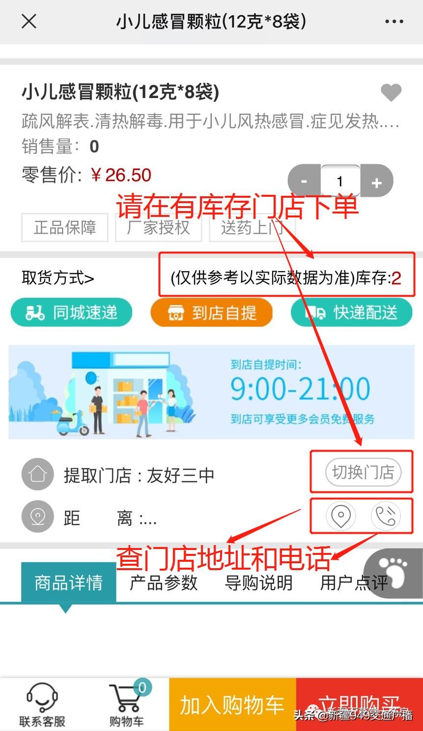 第三步:查看所需药品是否有货,门店距离是否离您较近,以便快速送达,核实完毕点击立即购买。