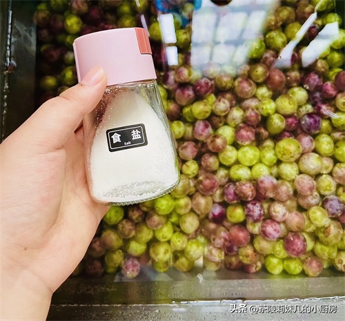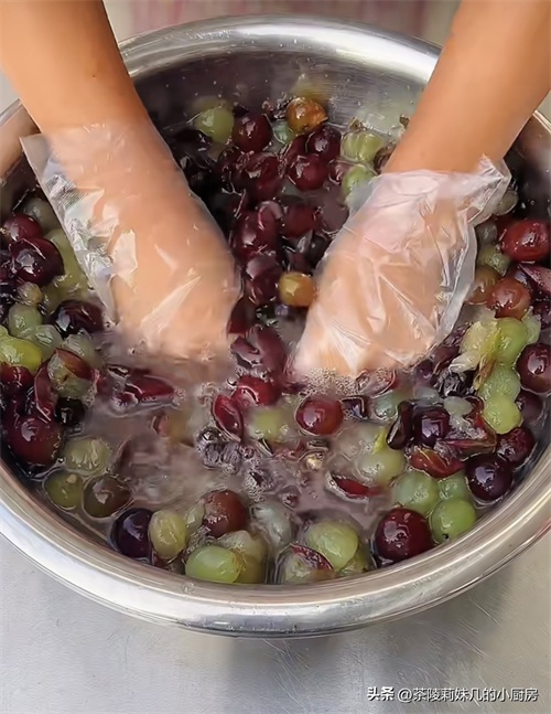 2:挑拣好的葡萄,我们放入盆中,用清水洗干净,然后再剔除枝梗。如果担心洗的不干净、或者有虫卵的残留,也可以放入一丢丢食用盐,可以起到杀菌的作用。将葡萄清洗干净后,我们单独放置一个通风的地方,用来沥干水分。