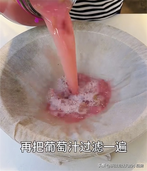 5:经过初级发酵后,酒液与沉淀物,已经开始分离了,我们将上面的一层漂浮物捞出,然后放入大纱布袋中,过滤一遍汁水。后将酒液转入另一个清洁的容器中,进行二次发酵,这样做出来的葡萄酒,颜色比较清澈、色泽也亮。