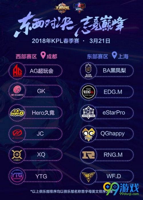 东部赛区由BA、EDG.M、eStarPro、QGhappy、RNG.M、WF.D这6支俱乐部组成,比赛主场留驻上海;西部赛区则由AG超玩会、GK、Hero、JC、XQ、YTG组成,比赛主场西迁成都。
