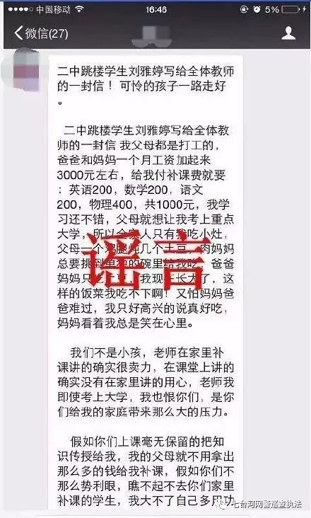 近日,部分我市市民的朋友圈里,有人传播着“二中学生刘雅婷跳楼前的一封信”,文中对学校老师的补课行为进行了控诉,并称这名学生已经跳楼身亡。