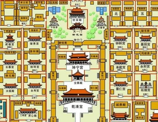 从中轴的乾清宫、坤宁宫到西六宫,中间隔着一条长街,称为西一长街,此街从御花园西门出来向南,其北端为长康右门,南端为内右门,街东为端则、增瑞、隆福、凤彩、月华诸门。长街西有大成右门,进去则为储秀宫,宫前为体和殿,其后为丽景轩。长街又有广生右门,进去则为翊坤宫,还有咸和右门,进去则为永寿宫。