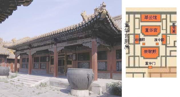 西六宫北有重华门,门内为崇敬殿,殿北为重华宫,宫东为葆中殿,西为浴德殿,宫后为翠云馆,宫东为漱芳斋,斋前为演戏台。