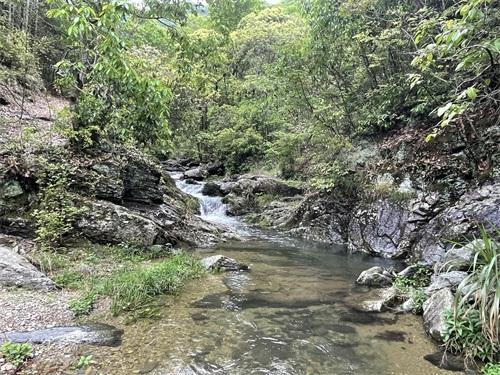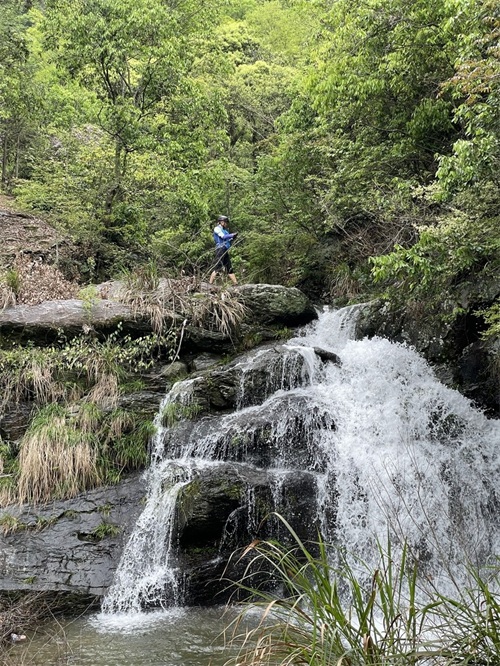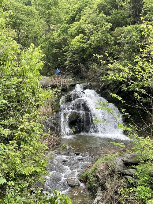 五:离开柯村,沿着Y025向北的线路,就是通向新四军军医院的通道一路骑行,快到目的地的一个小桥处右拐,再次进入深山之中,这条路叫Y021,一直通向美溪河大河口,交界处是一个大型的石拱桥。这条路是今天的福利,一路上大大小小的几十条瀑布从山林的奔流而出,沿路都是瀑布激扬清越的声音;快到终点时,进入高潮,一个大型的瀑布出现眼前,瀑布水流湍急,奔越山林而下,而瀑布出自的山林峡谷,清幽雅致,让人留恋不舍。更加叫人叫绝的是,溪流边上总会有那么一株或者两株,或是深红,或是浅紫的杜鹃花在溪水边绽放,如果美妙的仙女在溪流边凝神,那一份宁静的艳丽、优雅、柔和而又不失热烈,给人无尽的遐想。