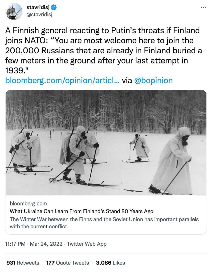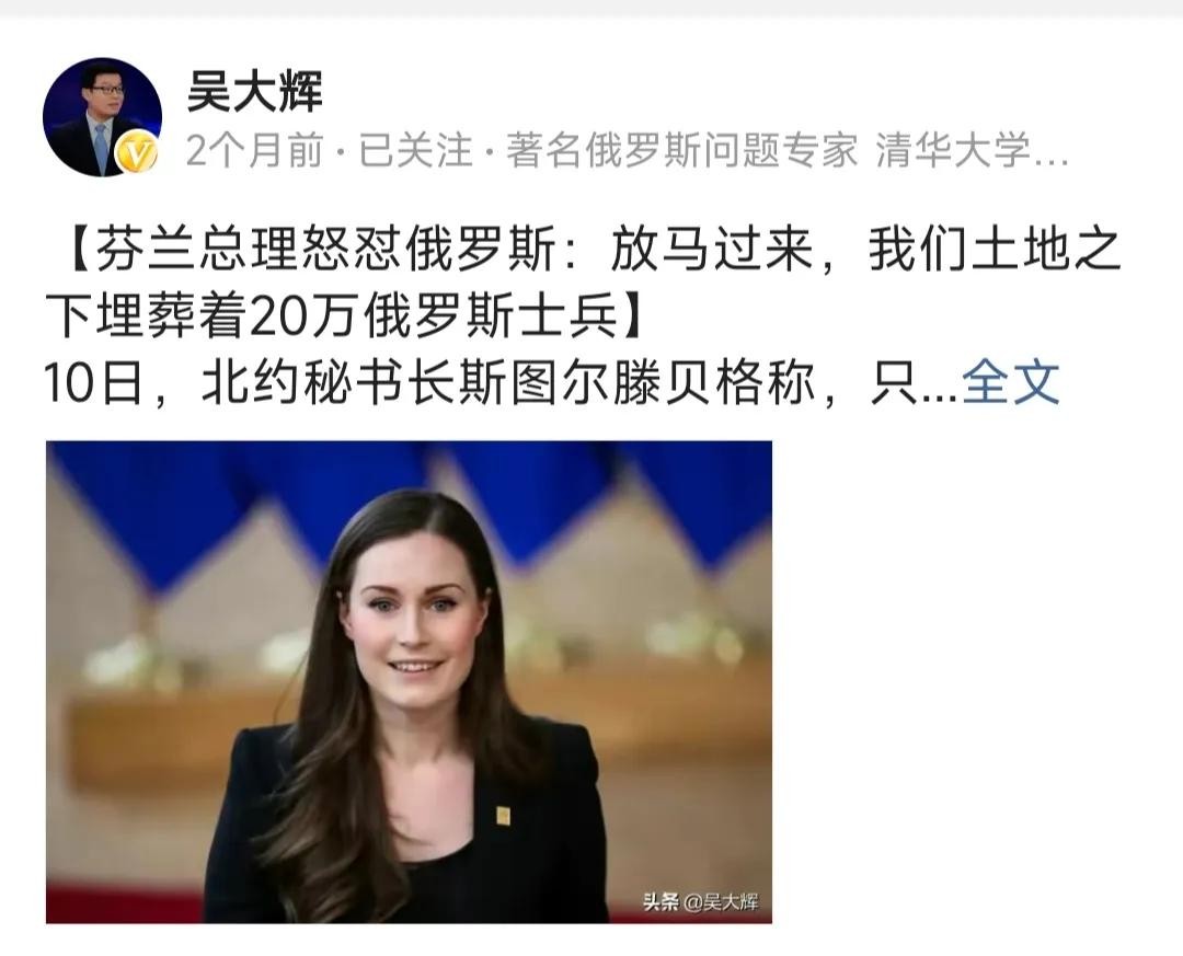 举例来说,他发布的《芬兰总理怒怼俄罗斯:放马过来,我们土地之下埋葬着20万俄罗斯士兵》的假消息误传网上,博取了好几百万的阅读流量。害得环球网好多次辟谣。事实证明这就是一个活脱脱的假消息。至少芬兰驻华大使馆新闻文化参赞何天明(Timo Sysiö)于4月12日向媒体确认,芬兰总理马林没有说过这句话。通过检索,提及这个说法的还是3月24日一个叫詹姆斯·斯塔夫里迪斯(James Stavridis)发布的推文:“一位芬兰将军对普京在芬兰如果加入北约发出的威胁作出反应:我们非常欢迎你来这里加入20万俄罗斯人的行列,这些人在你们1939年作出最后一次(威胁)尝试之后,已经被埋在芬兰地下几米处了。”而这个人曾经担任过北约最高军事长官——欧洲盟军最高司令。