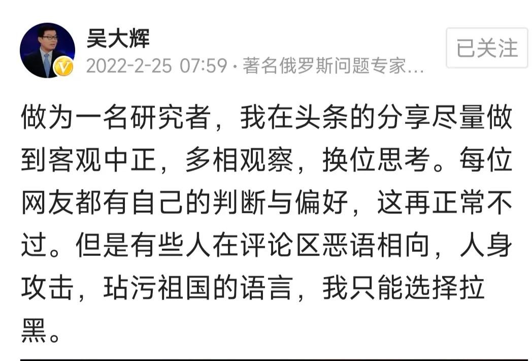 我还是比较喜欢司马南和胡锡进这类的网上专家。观点直白透顶,好恶分明。不做事后诸葛亮。错了还能道歉。当然,吴大辉教授也不是骑墙派。偏向乌克兰可能是他的信念或研究方向。问题是他戴着俄罗斯问题专家的帽子,还是个著名的专家,谁从他那里得到了他对俄罗斯问题鞭辟入里的分析和解读了呢?也有可能是为了在央视上更加严谨出彩的缘故吧!但至少窥一斑而现全豹!包括我在内的头条里的六十多万粉丝真希望这位俄罗斯问题著名专家哪怕是能发表一篇关于俄乌冲突以来的具有真知灼见的文章也好啊!也许是我格局太小,也无法读到他发表的高深阔论。希望这是最有可能的猜测或结果吧!我纯属杂谈,并充满善意!