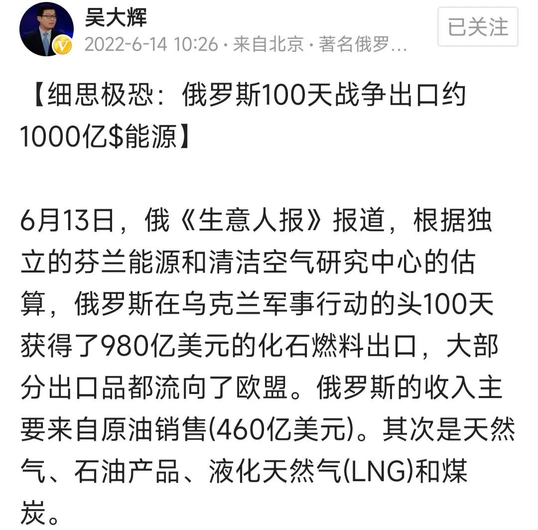 再比如,而对于俄罗斯100天战争出口约1000亿美元的能源,他的反应是“细思极恐”!俄《生意人报》报道说,俄罗斯在乌克兰军事行动的头100天获得了980亿美元的化石燃料出口,大部分出口品都流向了欧盟。俄罗斯的收入主要来自原油销售,其次是天然气、石油产品、液化天然气和煤炭。