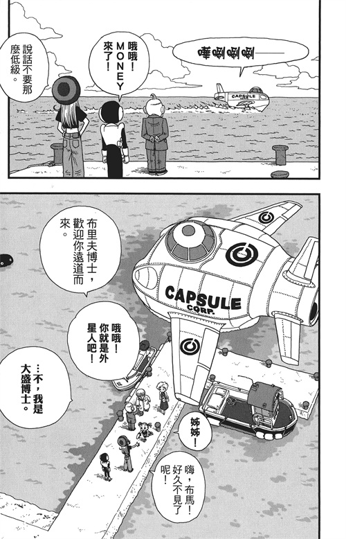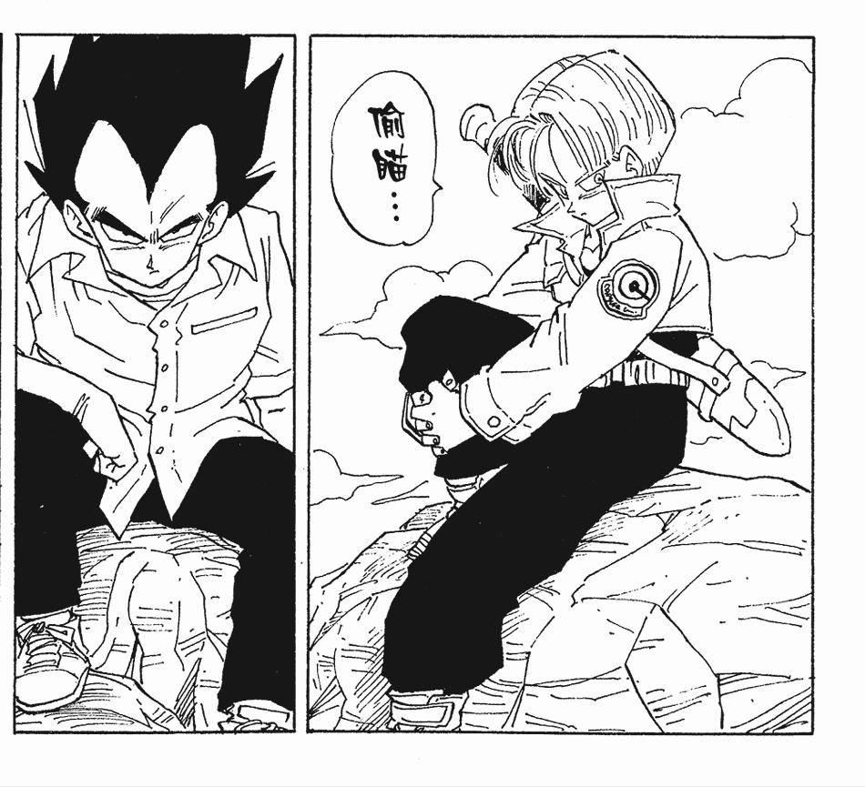 我们可以从上图中停泊在海边的飞行器上,看到属于胶囊集团的圆形标志。而这个标志,很多朋友应该会觉得非常眼熟,因为和《龙珠》中特兰克斯外套臂章上的标志是基本一致的。毕竟特兰克斯是布尔玛的孩子,他和胶囊公司有着重要的关系。