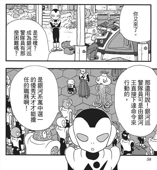 所以综合来讲,银河巡警队是一个报名9人只能录取5人、队员都是矮个子精英、武器装备精良、直属于银河王的、38名队员组成的庞大机构。