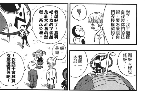 在布尔玛一家的帮助下,加克的宇宙飞船很快修好了。而布尔玛的父亲布里夫博士,在维修飞船的过程中,获得了宇宙飞船的反重力技术。