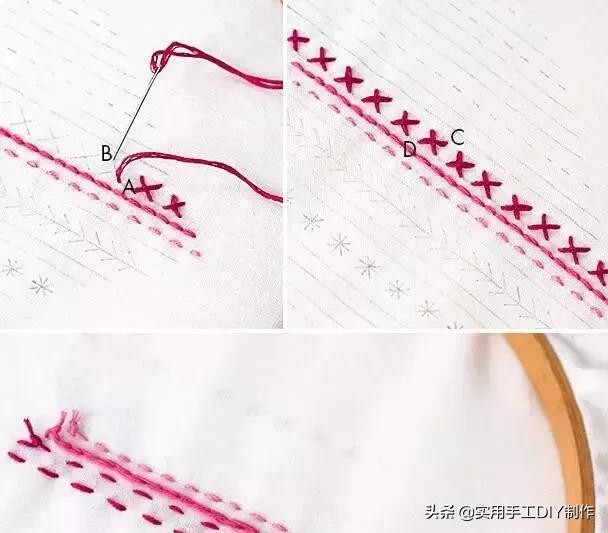 接下来我们将尝试我们的第一个比较复杂的装饰针脚!从图案的底部开始,将针穿过A处,然后从B处穿入(创建斜直线针脚)。接下来从C到D进行第二个针脚。确保每个交叉(x)重叠在同一方向。完成行并打结后,请注意绣布背部。