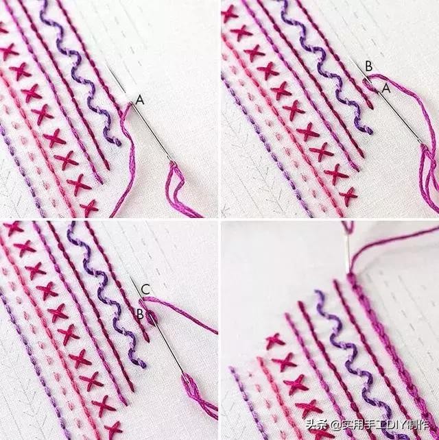 从图案的底部开始,将针穿过A处。然后向后走穿过B到背面再从C穿出,再从A穿入,不断循环这个过程。