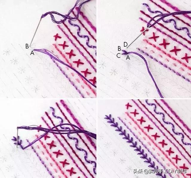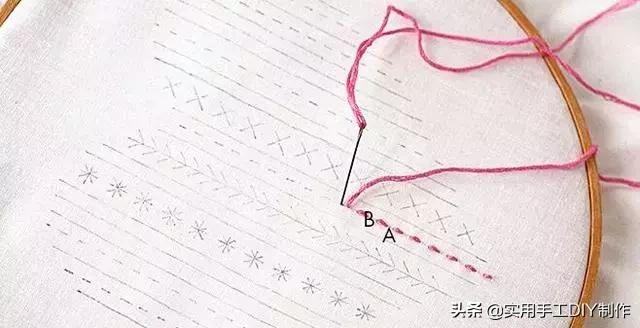 这种针法由三个相同长度的直线针脚组成,从相同的中心点A辐射出去。从图案的顶部开始向下移动,将线穿过A,然后做到直线针到B 。