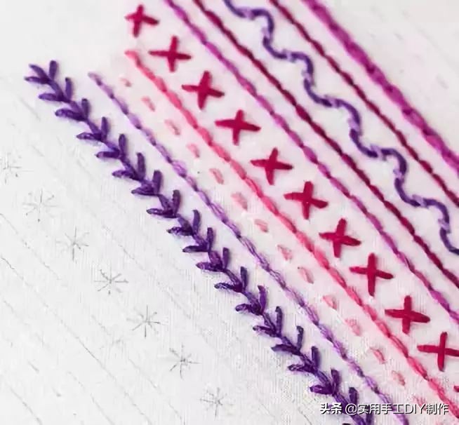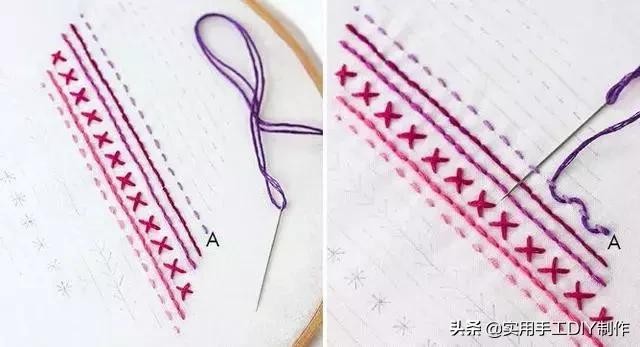 首先绣出平针针脚。然后取一根不同颜色的绣线进行编织。