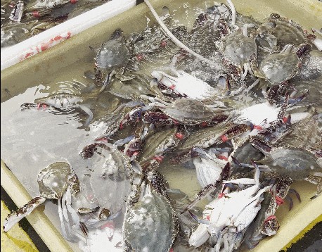 在合庆码头,记者看到在摊位上,梭子蟹被放在了显眼位置,商户们通常会按照个头大小来区分,根据品质不同,价格也不尽相同:小的梭子蟹价格基本在10元—35元左右/斤;品质好的梭子蟹,价格平均在60元—70元/斤。