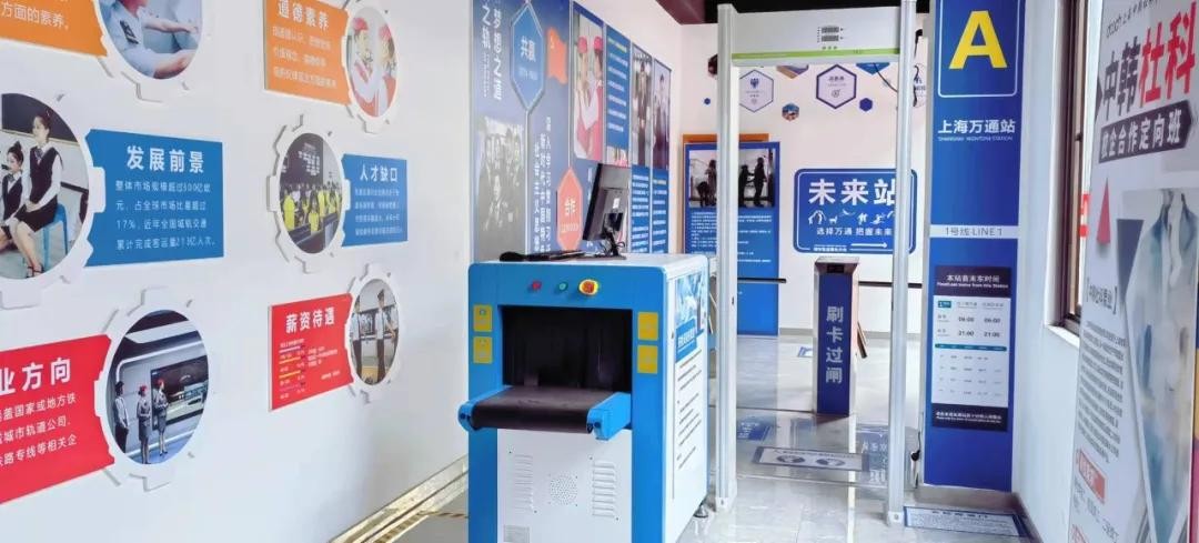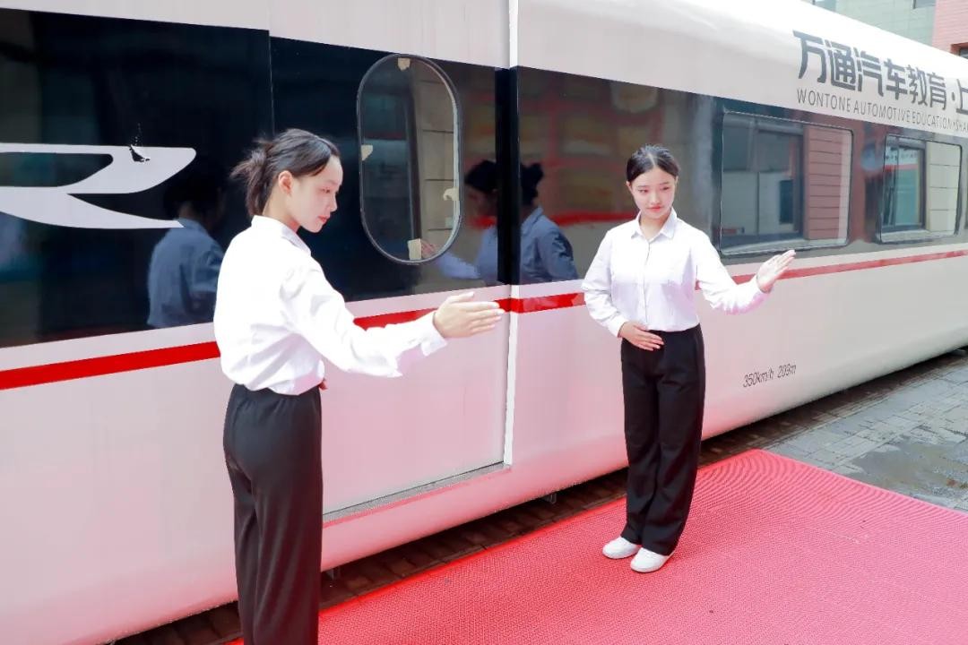 上海万通铁路列车乘务专业配备有高铁实训舱,高铁实训舱包括有高铁复兴号车头、车厢训练等,车内附加有以下内容:全功能的门,行李架,旅客座椅二等座,乘务员控制室、餐桌、座椅、吧台、内话广播系统等。每个学生配备有专业的乘务服装。