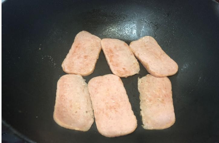 2、鸡蛋饼摊好了盛出来,把午餐肉提前切成薄片放进锅里面煎两面金黄。就用煎鸡蛋的油来煎午餐肉就行。