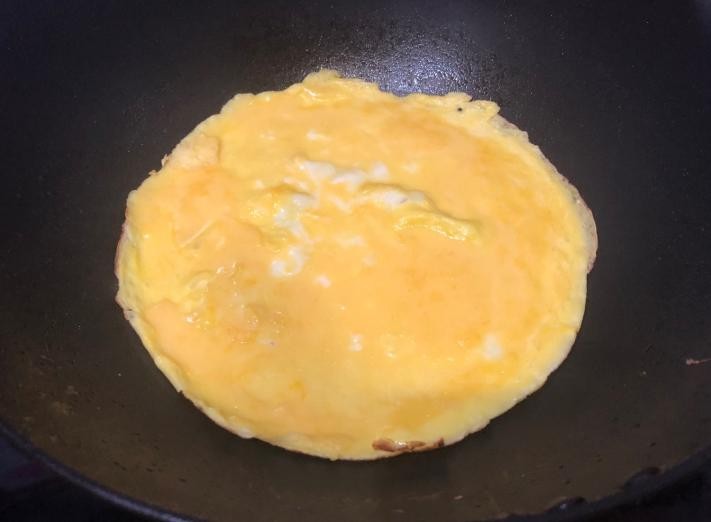 1、先把3个鸡蛋搭建碗里,用筷子快速的打散搅拌均匀,再加入少量的牛奶。锅里面烧油,小火将鸡蛋液倒进去摊成个鸡蛋饼。刚下锅的时候不要着急翻动鸡蛋,来回的晃锅帮鸡蛋摊圆,不用铲子。煎好另一面再翻过来煎。