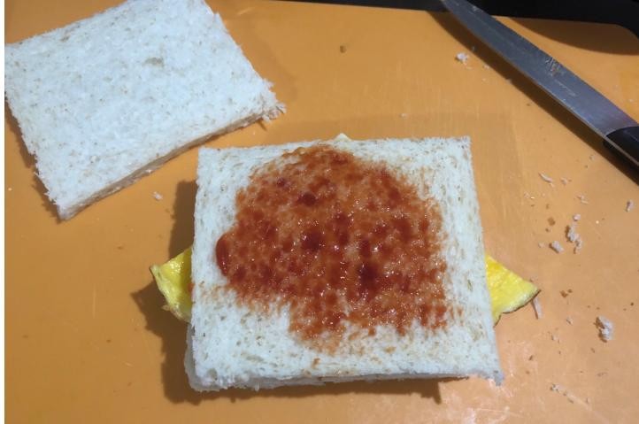 4、取出来其中的一片吐司,在当面涂上番茄酱,尽量涂的均匀一点。大家有喜欢其它口味的酱都可以,比如沙拉酱,黑胡椒酱,蛋黄酱等等。煎好的鸡蛋切下来一块放在上面。