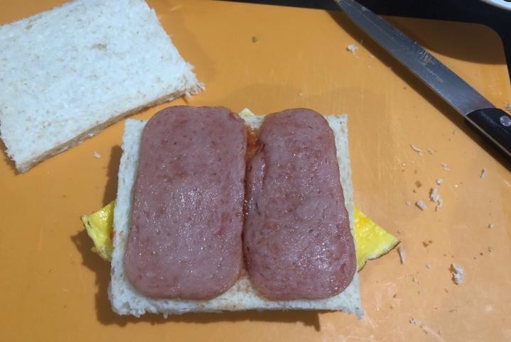 8、斜着刀切开就可以了。三明治的做法有非常的多,我这个就属于是比较经典的做法,放了午餐肉还有鸡蛋。大家有喜欢吃什么蔬菜水果的,还可以放生菜或者西红柿在三明治里面,口感都非常丰富的。我喜欢吃三明治也是因为它比较多变,今天吃个经典的加了鸡蛋跟火腿的,明天就可以换成放了蔬菜的,都一样好吃美味,关键是还简单。