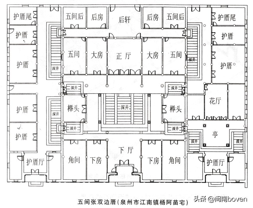 这个五开间旁边就是一条护厝,护厝可以两边都有,也可以只有一条。