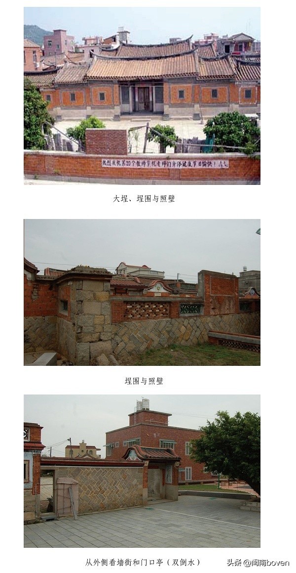 大埕周围建围墙,以区隔埕与外界,称做埕围或墙街。埕围低矮,以石头、砖瓦筑成栅栏或镂空窗,使下落正面一览无余。墙围正对大门处增高做照壁,以挡煞气。通常还在照壁上画八卦或者福字。墙街上设门,称做墙街门,一般设在左右两侧,也有单边设门。简单的只留门道,门框也不设。若设置双倒水(悬山)、四倒水(歇山)的屋顶,则称做门路亭。