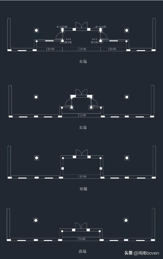 一是“双塌”,传统做法是在孤塌的基础上,在大门处再内凹一次,形成凸字形空间。双塌正中为大门,两侧设边门(称左右阁门)。