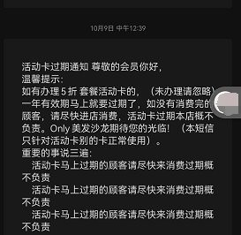 根据该店公众号10月9日发布的信息显示,办理5折套餐活动卡的,一年有效期马上就要过期了,如没有消费完的顾客,请尽快进店消费,活动卡过期本店概不负责。