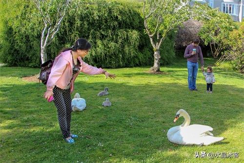 在艺术宫池塘边的草坪上,有一对成年的白天鹅带着两只灰色的幼崽在这儿休息。大天鹅看起来温顺,但却不能太靠近它哟,否则它会主动出击的。