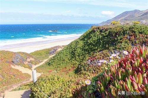 一条大约500米长的弯曲小路指向海滩,山坡上长满了类似肉肉的热带植物,看了一下路边的牌子:GARRAPATA加利福利亚州立公园。