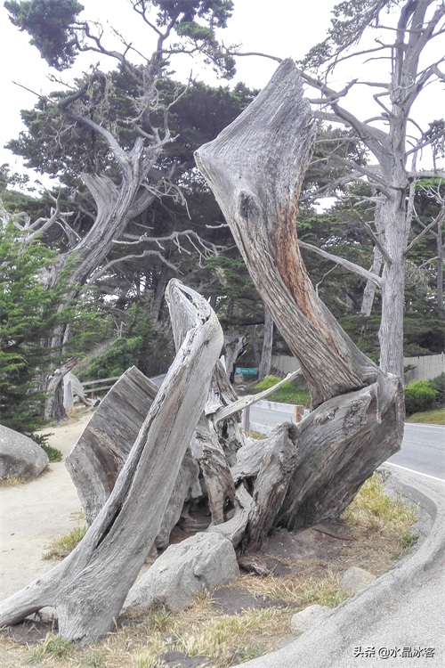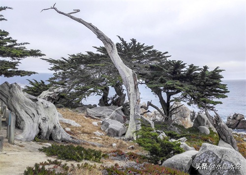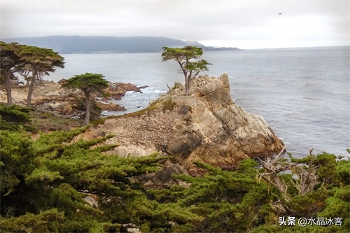 悬崖下,在伸向海中的一块巨大的礁石上,孤零零地生长着一颗有200多年树龄的柏树,据说这颗顽强的“孤独柏”象征美国精神。