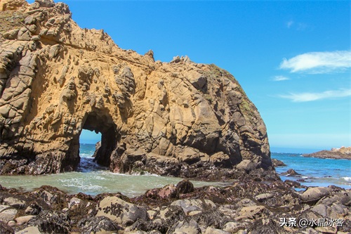除了紫色沙滩,在海边还有一座碓石拱门,它看上去饱经沧桑,被海水海风浸蚀得伤痕累累。在它旁边有一大堆乱石,在石头上铺满了黑色的有点臭味的类似海带的咸水植物,湛蓝的海水通过拱门到了这儿都变混了。