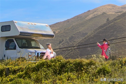 瞧,这不是,才没走多远,又有停车的地儿了,而且还有房车。要知道在6年前,国内几乎还见不到房车,所以才有了打卡房车的两位小姑娘。