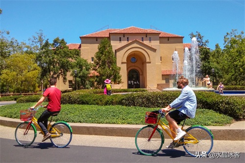 小史跑到了前面,向喷泉方向去了,两位估计骑的是施坦福大学自行车(类似谷歌总部的那种彩色的内部自行车)的人过来了,他们也偏头瞄向喷泉。