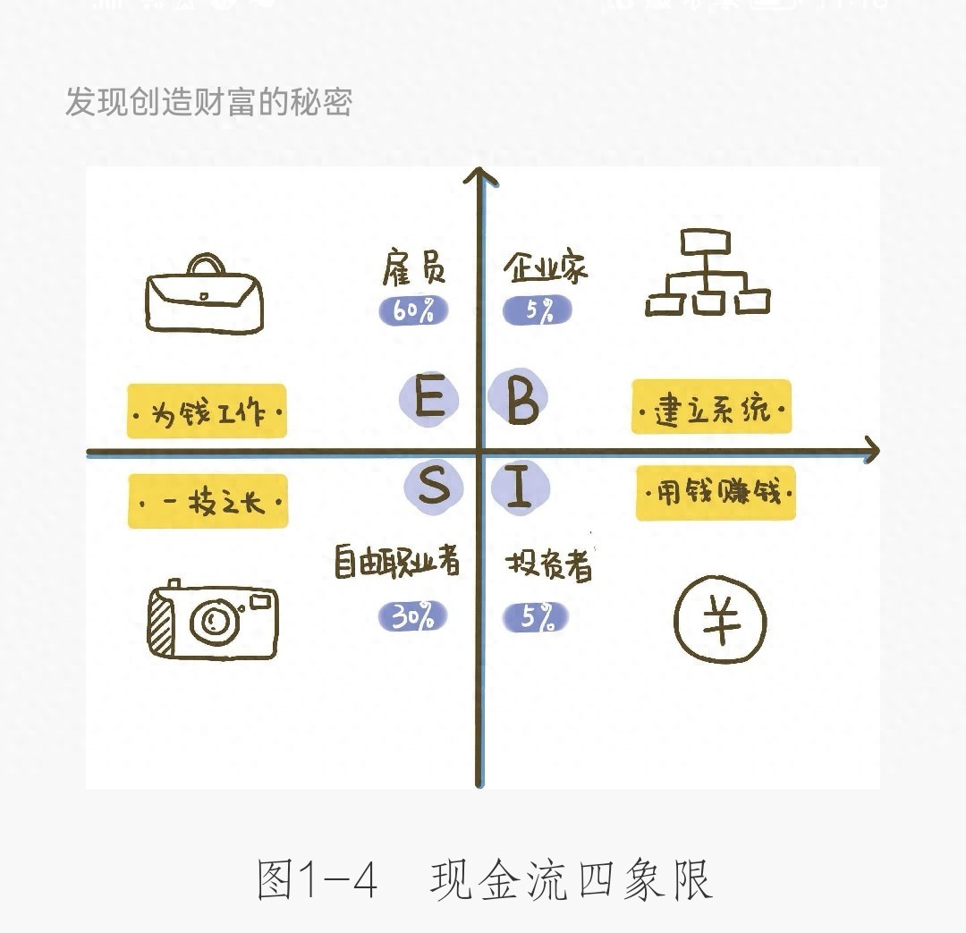 这四个象限都有可能发财,也都有可能变得贫穷。富爸爸告诉我们,希望让钱为自己工作,而不是我们去为钱操劳一生,花掉一生去为钱工作是愚蠢的,他们要的是更多的时间闲暇,以便可以照顾健康和家人,做自己喜欢的事情。这就是作者说的,他不愿意去干左边的工作,而时刻想着在右边,也就是在企业主和投资人之间寻找机会的原因。