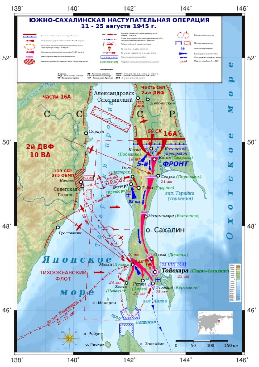 在远东战役之外的地区,苏军还在处于进攻当中,首先是对南库页岛的作战,8月11日,远东第二方面军第16集团军的56军在航空军的配合下向驻守南库页岛的88师团发起进攻,16日,苏军摧毁日军防线,20日占领真冈港。不过在这时便出现了插曲,根据日方资料的记载,8月22日日军与苏军达成停战谈判,但是在已经停战的情况下苏军仍向继续发起进攻,8月25日苏军宣布库页岛的战事结束。日本方面的记载指责苏联此次行动是违背停战协定的趁火打劫,苏联方面则认为对南库页岛的进攻实际上是加速日本正式签署无条件投降。当然,对斯大林而言,库页岛战役同时也是苏联一雪1905日俄战争之耻,所以不得不继续进攻。