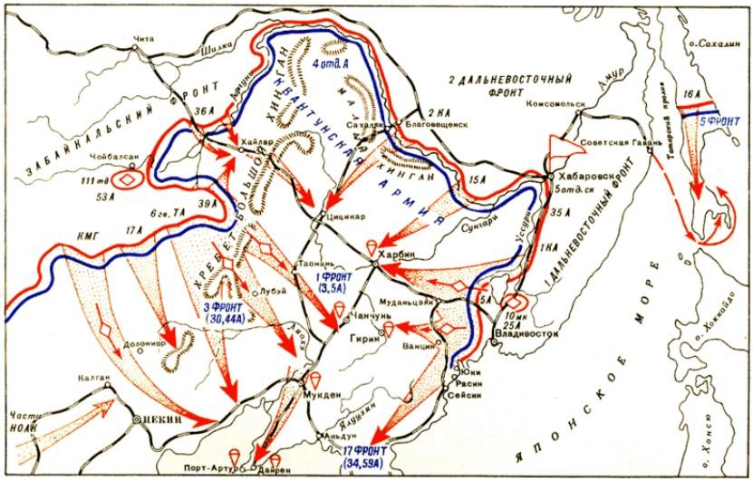 针对于中国东北复杂的地形,如果对西面发起进攻,那么自然是理所当然的撞上大兴安岭,最终苏联计划的狂暴攻势便会因为大兴安岭的崇山峻岭而大打折扣,而在东面,则是日军修筑的要塞,上文中提到,日军的要塞修筑的相当严密,如果计划出错,那么很有可能会使得进攻变成一场在钢筋混凝土要塞前的单方面屠戮,因此,在将领的人事任命上,苏联方面尽可能的采用有在山地或者严酷地形作战经验的将领来进行此次行动,苏军将部队分为三个方面军:马利诺夫斯基率领的外贝加尔方面军、普尔卡耶夫率领的远东第2方面军和梅列茨科夫率领的远东第1方面军,华西列夫斯基任远东苏军总司令。苏军计划一场自始至终的“大纵深战役”,为此要求外贝加尔方面军从蒙古境内实施进攻;远东第一方面军从滨海地区实施进攻;远东第二方面军从黑龙江实施正面进攻。各个方面军进攻的时候,必须“迅猛进攻”将日军分割在各个区域分批消灭。