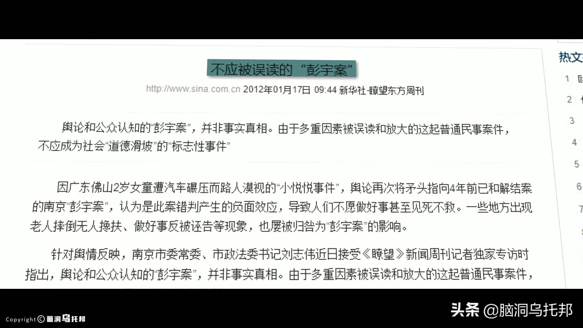 但《瞭望》周刊在2012年的一篇特稿《不应被误读的「彭宇案」》中却说,