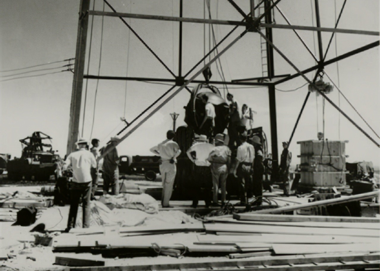 1945年7月12日一颗实验性原子弹开始进行最后装配。1945年7月16日5时30分美国在新墨西哥州离阿拉木郭多50英里的一片广阔荒芜地区成功进行了世界上首次核试验。至此美国成为全世界第一个拥有核武器的国家。根据当时的记录显示:美国试爆的这枚全球第一枚核弹爆照中心所产生的温度相当于太阳表面的一万倍,这样的高温使周围沙漠中的沙砾被熔成了玻璃。