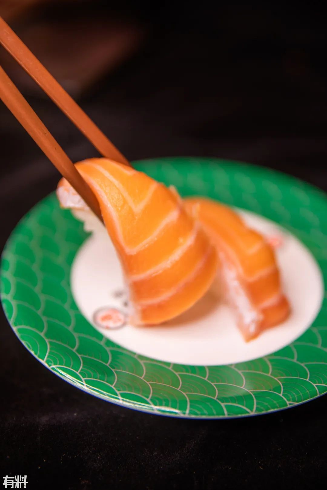 新鲜三文鱼腩现点现切,一整片超厚实!寿司入口嫩滑软弹,口感尤其新鲜,太惊艳了!